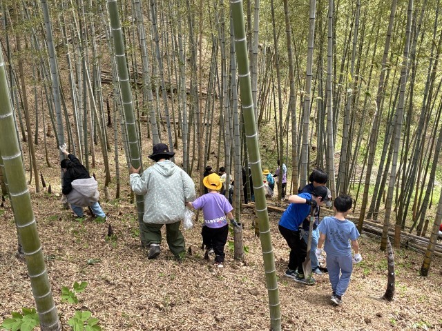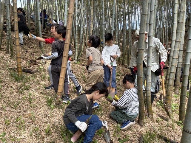 今日はたけのこ掘りの日です。6年生が掘り方や注意を説明した後、班ごとにたけやぶに向かいます。5.6年生はスコップ、3.4年生はシャベルで、1.2年生が採れたたけのこを一生懸命運びました!