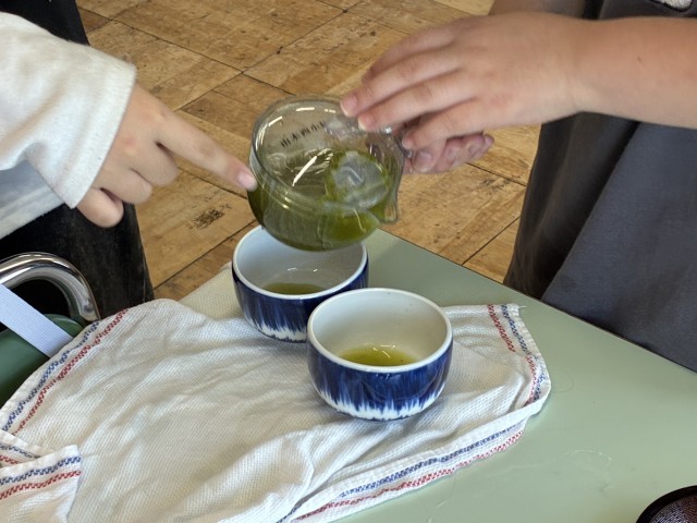 今日の5年生の家庭科は「美味しいお茶を入れるために」です。先日5年生は、狭山園のお茶マイスターの方から美味しい煎茶の入れ方を教わりました。今日は校長先生や保健の先生を招き、学んだことをいかして、美味しい煎茶を入れてくれました。