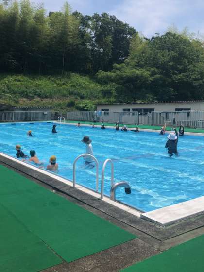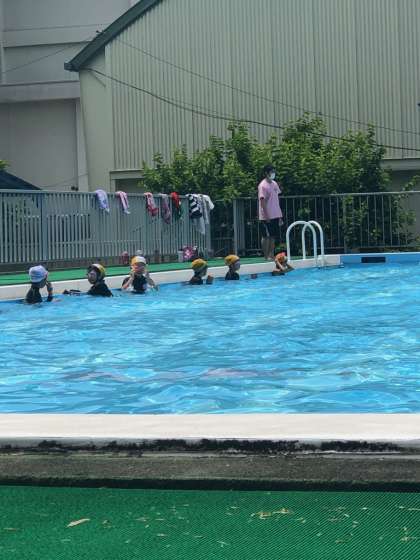 3・4年生は、自転車教室後すぐにプールの準備をして、今年度初めての水泳です。先生の指示に従い、けのびの練習をしています。