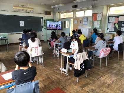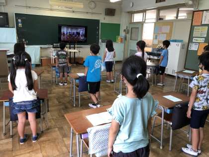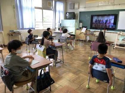 今日は土曜授業です。当初の計画では本日は学校公開でしたが、緊急事態宣言延長に伴い、公開は中止となりました。例年この日に開催しているミニコンサートは、事前に録画した映像を、Google meetで各教室に配信する形で実施しました。プログラムに沿って音楽の星野有子先生が司会進行をしながら各学年の演奏を鑑賞しました。