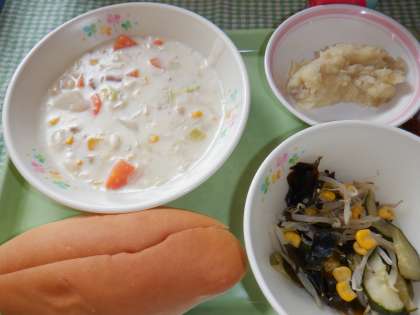 今日はクリームシチューに入りました。由木西自慢のベシャメルソースとうまみたっぷりのベーコンでおいしいシチューに仕上がりました。