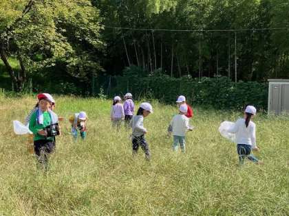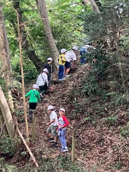 後半は校庭での虫探しや学校林探検です。時間の経つのを忘れて虫を追いかけたり、急な坂道や竹林の薄暗い場所にドキドキしたりしながら楽しい時間を過ごしました。