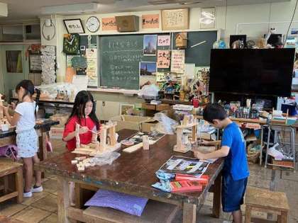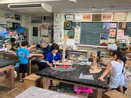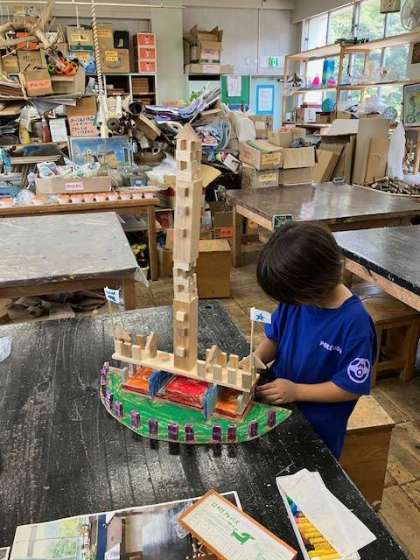 たくさんの木片を使った私だけの「すてきなおしろ」みんな堂々としていてどの作品も力作!そんな豪華なおしろが完成しつつあります。最後は全員で使った机を水拭きし、床を掃き、今日の学習を振り返って終わりました。