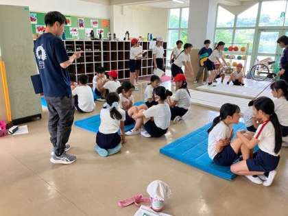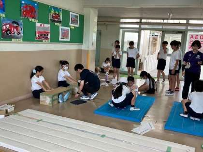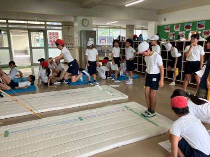 今日は昇降口前ホール、校庭、体育館などを使って体力調査が行われました。立ち幅跳び、上体おこし、長座体前屈など8種目に取り組みました。
