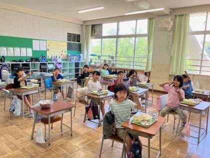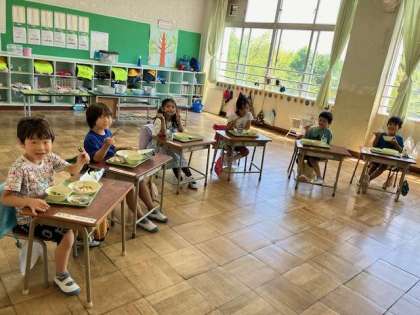 6月は食育週間です。今週はがんばりカード「めざせ!おはし名人」を使って5つのはしの使い方に取り組みます。今日のテーマは「つまむ」です。五目煮豆に入っている大豆を上手につまむ1.2年生の様子です。写真を撮った後、パクッと大豆をいただきました。