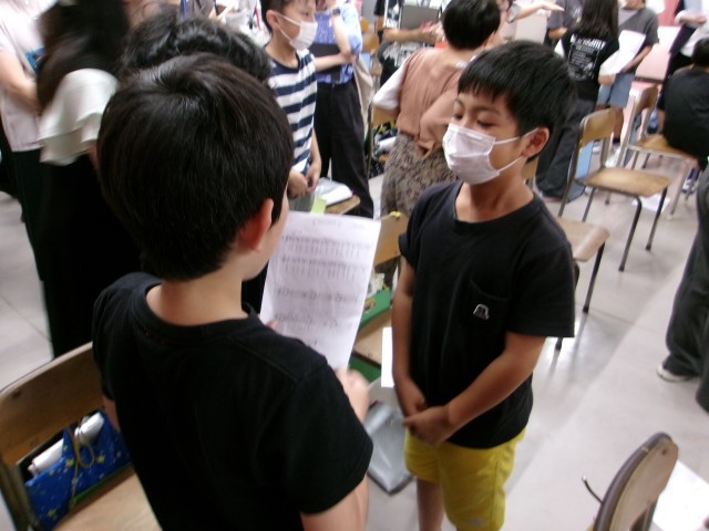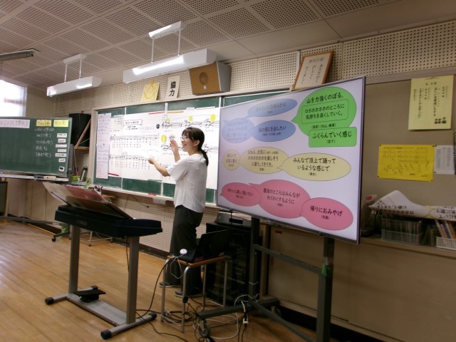 4年生の音楽の授業を参観しました。「ゆかいに歩けば」の教材を使って旋律の特徴をとらえて表現する学習に取り組んでいました。どのように歌えばよいのかを「歌の技カード」を手掛かりに歌い試したり、友達と聞き合いながらさらに表現を工夫したりと、自分の考えを歌声で楽しく表現する姿がありました。歌詞や曲調を考えながら、「山を力強く登る感じ」や「風が吹いている様子を表現したい」、「滑らかに歌うところと、跳ねるように楽しく歌うところがある」など、豊かな表現で教材を解釈し、歌い方だけでなく全身を使って楽しく歌う姿がありました。