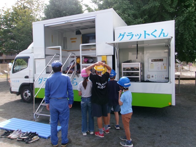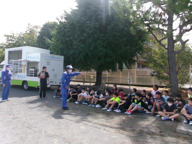 今日の避難訓練は地震を想定した避難訓練でした。その後、市の防災課の方をお招きし、起震車体験を行いました。毎年、5年生が代表となり、地震など大きな揺れに襲われたときの身の守り方の訓練をしています。