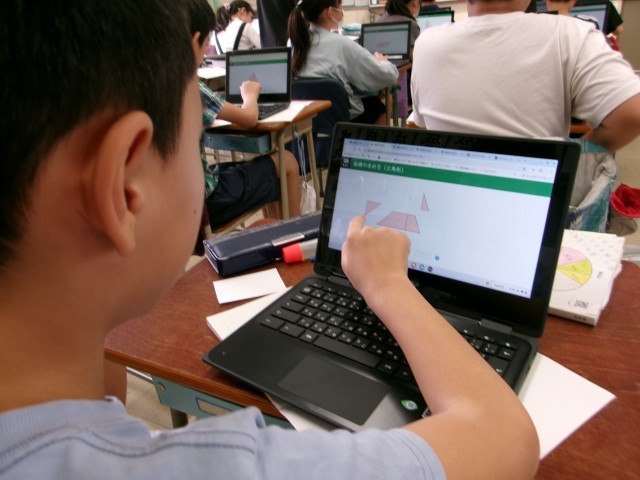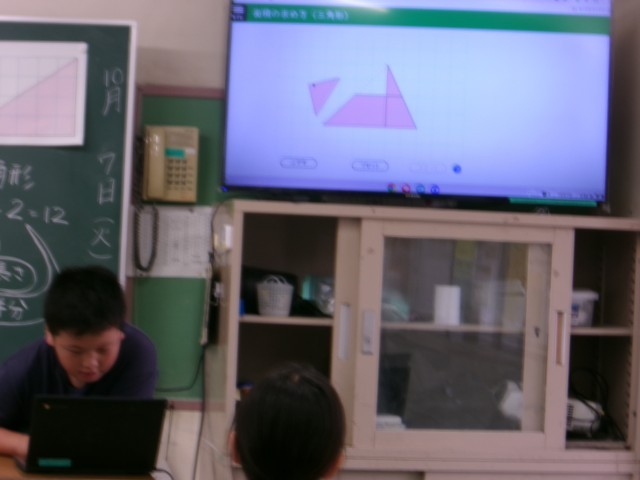 5年生の算数の授業を参観しました。「面積」の単元で、今日は三角形の面積の求め方をこれまでの既習事項を活かして求める学習に取り組んでいました。前回、直角三角形の面積の求め方を学習しましたが、今日は直角三角形ではない三角形の求め方を考えました。タブレットで図形を2つの直角三角形に分けて考えたり、変形させて長方形や正方形に変えたりと、これまで習った面積の求め方を使って自力解決をし、考え方を共有しました。図形を操作しながらいろいろな形に変形させていくのことで、様々な」求め方ができることを確認していました。