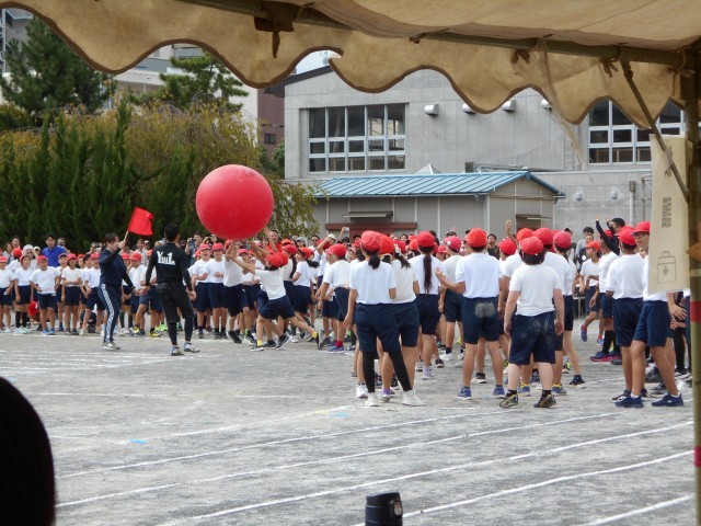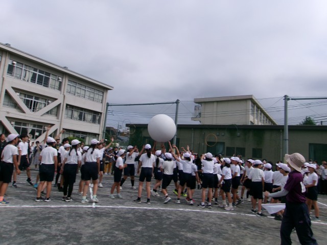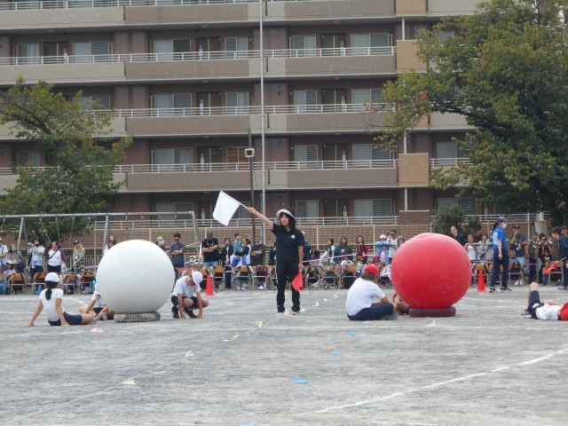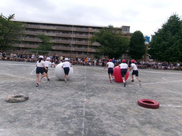 最後の種目は、「由井一大玉運び」です。全校児童が力を合わせて競う団体競技です。赤組・白組それぞれ全員が列を作ったレーンを2周回って早くゴールについた方が勝ちとなります。赤白それぞれ、必死で大玉を運び、それを係の児童が懸命にゴールまで繋いでいきます。1年生から6年生までが協力しながら大玉をつなぐこの競技は、毎年盛り上がります。