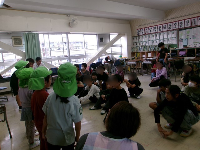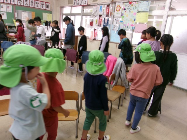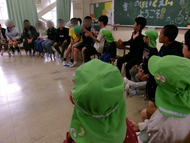 保幼小連携の日の取組として、保育園の年長さんと5年生とが交流会をしました。保育園では、災害が発生した際、本校の校庭が避難場所の一つになっています。今日は避難訓練の一環として本校への避難の練習をした後、年長児さんが残り、5年生と交流をしました。各学級で自己紹介をした後、5年生が考えたゲームをして楽しみました。