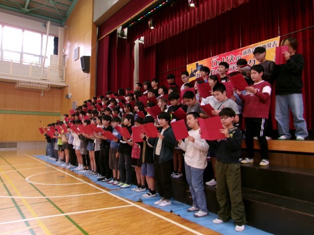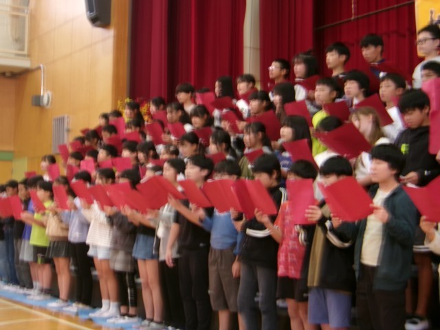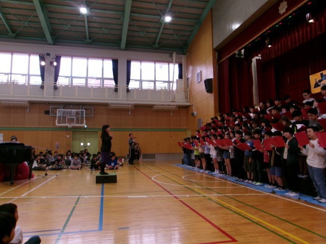 後半は6年生がこれまで平井先生と一緒に取り組んできた成果を全校児童の前で発表しました。「歌声をひびかせて」は、1番から3番までを斉唱し、後半は3部合唱で披露しました。高音の難しいパートまで美しい歌声をひびかせている6年生にみんななくぎ付けでした。また、平井先生が6年生のために作ってくださった「今日という未来」のい2部合唱も、6年生ならではのハーモニーが体育館中に広がり、すてきなコンサートになりました。