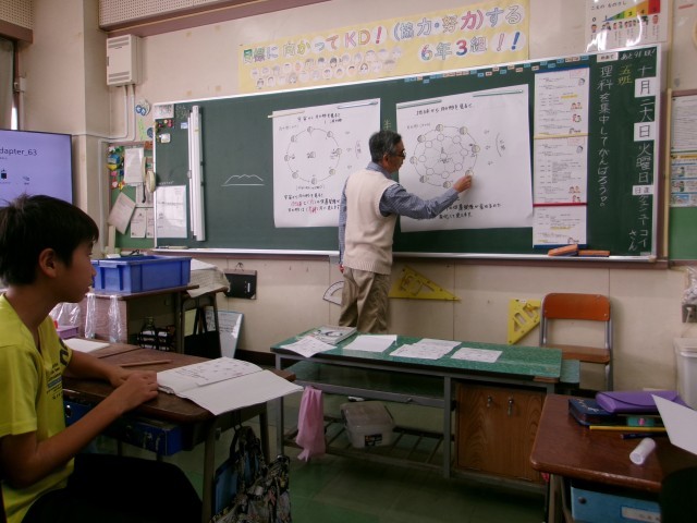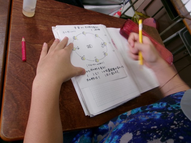 6年生の理科の授業を参観しました。「月と太陽」の学習では、月の形が日によって変わって見えることを、太陽と月の位置関係を基に学習を進めてきました。今日はそのまとめとして、プリントを使いながら、これまでの学習の振り返りを行いました。図で示された地球と月、そして太陽の位置を見ながら、月の形が徐々に形を変え、見える位置を変えながら動いていく様子について、「地球から見た月」と「宇宙から見た月」なども比較検討しながら、太陽との位置関係によって見え方が変わることへの理解を深めていました。教室では見ることができない月や太陽について、イメージしながら学習を進めていました。