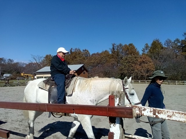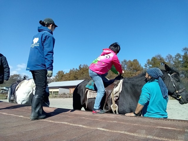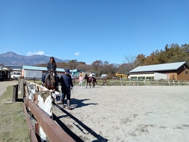 二日目のメインイベントは滝沢牧場での牧場体験です。学級ごとに、乗馬体験、家畜の餌やり、トラクター体験をします。乗馬体験では、サークルを一周します。緊張しながらも、貴重な体験ができたようです。