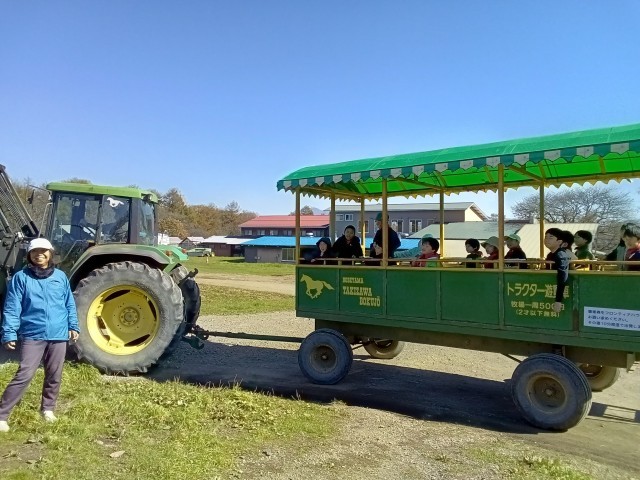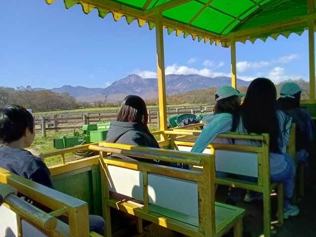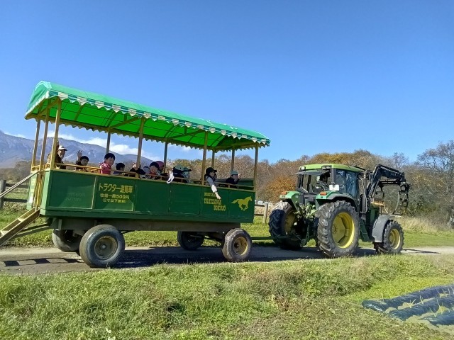 トラクター体験では、トラクターに乗車して牧場周辺を一周しました。悪路でガタガタ揺れる車内で、大きく上下左右に体が振り回されるたびに、わー!きゃー!と声が上がりました。雄大な八ヶ岳連峰を眼の前に、日頃できない体験を楽しんでいました。