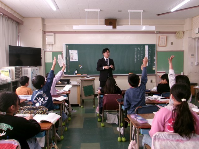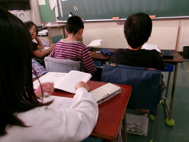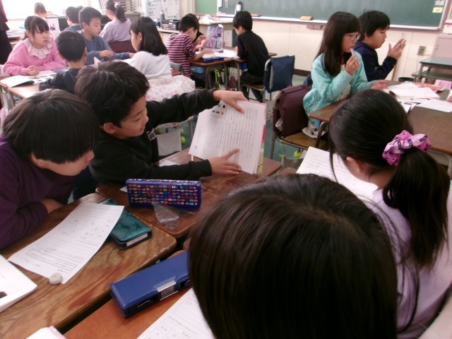 3年生の国語の授業を参観しました。「くらしと絵文字」の第1時間目は、範読を聞いて内容をつかみ、絵文字が昔から使われてきたことや、今やいたるところで様々な絵文字が使われていることを読み取りました。最初の文字が一文字下がっているところを手掛かりに15の段落に分けた後、書かれている内容を考えながら」「はじめ」「なか」「おわり」に分けてみました。グループ活動では、「絵文字の特徴が書かれているから『なか』だよ」「第一の特徴、第二の特徴~って書いてあるから、詳しく説明していると思う」など、教科書を手掛かりに話し合いを進めていました。絵文字は身近なものですが、改めてわかったことがあり、興味をもって読み進める姿がありました。
