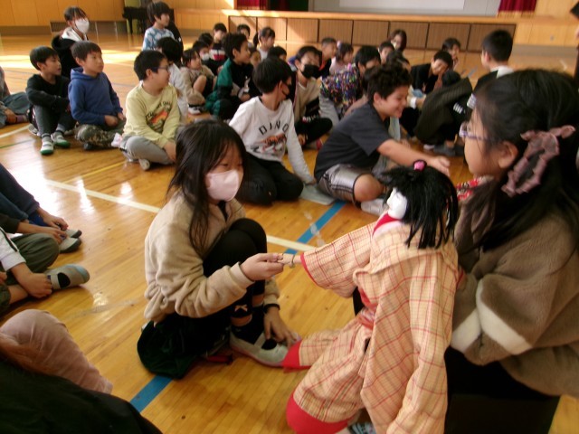 今日も3・4年生を対象に車人形の出前授業がありました。昔から伝わる「人形を使った演劇」について、「人形」が神様と人間をつなぐものであったことや、みんなの健康や幸せを願う踊りの意味などを教えていただきました。また、車人形の一つ一つのパーツの説明もあり、車人形の演じ方の工夫についても教えていただきました。顔の表情だけでなく、顔の向き方、手の先や足の動かし方など、一人で演じているとは思えない動きに、子どもたちは興味津々で見ていました。また、体験コーナーでは、人形を使った「泣いているしぐさ」「笑っているしぐさ」「怒っているしぐさ」を教えてもらいました。コミカルな動きに、見ていた子どもたちも大喜びでした。八王子の伝統文化に触れるだけでなく、ユーモア触れる内容に、子どもたちも大満足の様子でした。