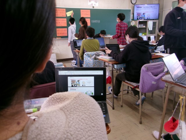 6年生の国語では、読書の世界を広げる学習の一環として、これまでに読んだ本をクイズ形式にしながら誰のおすすめの本なのかを楽しみながら考えていました。また、「ぼくの世界 きみの世界」の単元で、自分の見方や考え方を付箋に書き、班で話し合いながら、グループ分けを通していろいろな考え方を共有していました。また、社会科では、日本を近代国家として発展させた明治維新の3大改革について、何の目的で行ったかについて学習していました。6年生の学習も難しいですが、タブレットを活用したり、グループで話し合ったりしながら課題を解決しようとする姿が見られました。