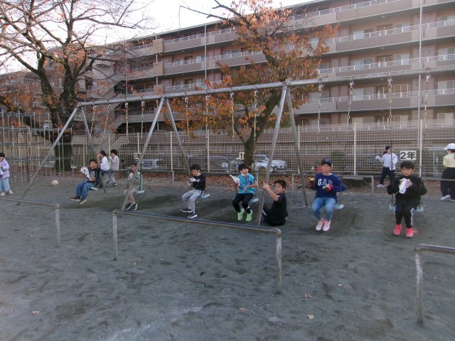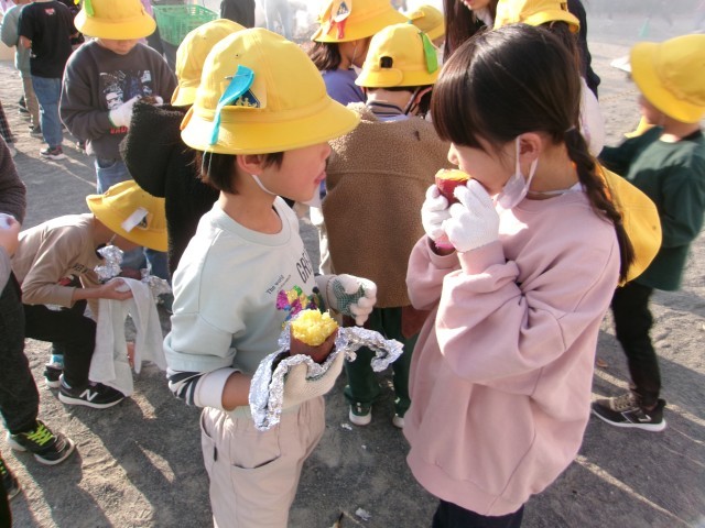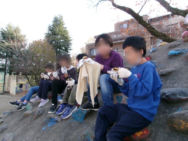 焼きあがるころには、多くの子どもたちが焚火を取り囲みました。今年のさつまいもも甘くておいしい。あっという間にぺろりと平らげていました。校庭やジャングルジム、石山の上など思い思いの場所で友達と焼き芋をほおばる姿は、幸せな顔そのもので、見ている私も思わずにっこりしてしまいました。