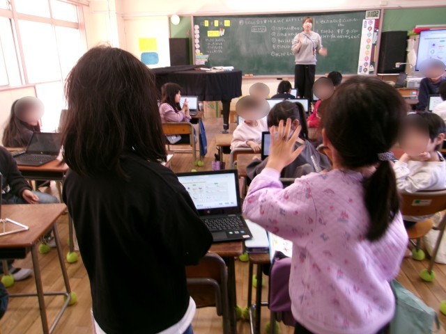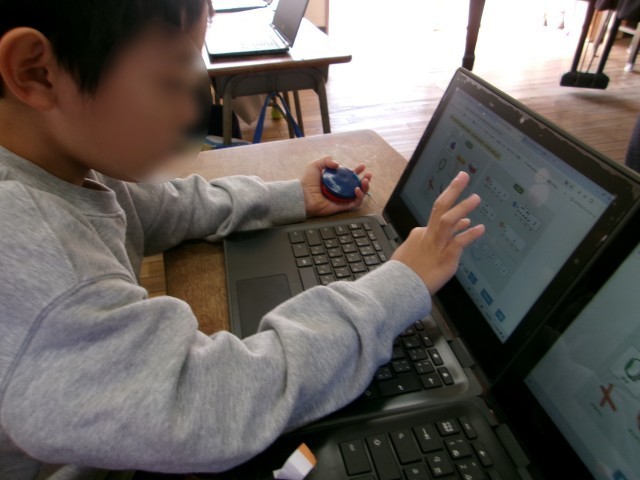2年生の音楽の授業を参観しました。タブレットを使って自分でリズムを考え、カスタネットやタンバリン、トライアングルなどの楽器で演奏する学習に取り組んでいました。二分音符や四分音符、8分音符や休符などを組み合わせ、自作したリズムを再生して聞いたり、音符を変えて確かめたりと、リズムづくりを楽しんでいました。発表では2人組で合わせて演奏し、どんな情景を思い浮かべて作ったかを伝え合っていました。自作したリズムの音を聞いて確かめることができることで、いろいろなアイデアが浮かび、試行錯誤しながら作っている様子が見られました。