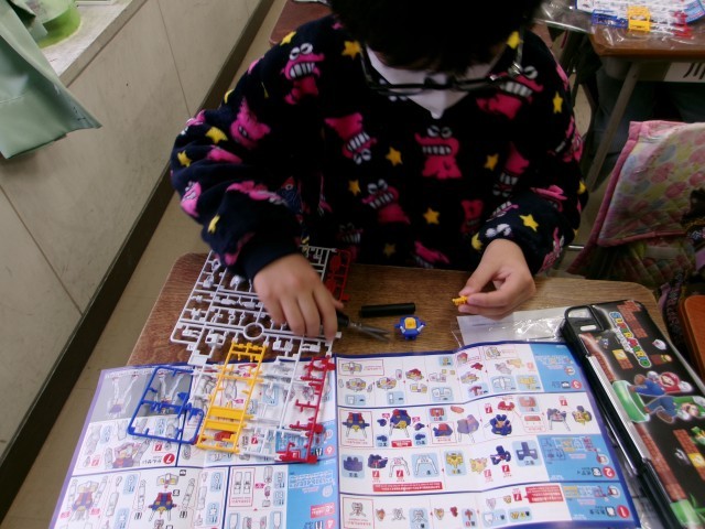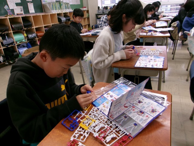 後半は、プレゼントでもらったガンダムのプラモデル作りをしました。活動が始まるとマニュアルを見ながら一つ一つのパーツを各々組み立てていきました。学級中がしんと静まり返るほどの集中ぶりで、プラモデル作りに没頭する姿がありました。