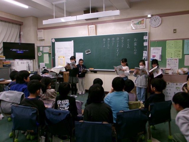 2年生も、テストやプリントの間違い直し、九九検定など竿後のまとめの学習に取り組んでいました。ドリルパークを使った算数問題に挑戦している子もいました。また、これまでの学習の成果発表としてお楽しみ会をする学級もありました。クイズや教科書の音読劇など、得意分野を活かした発表会になっていました。