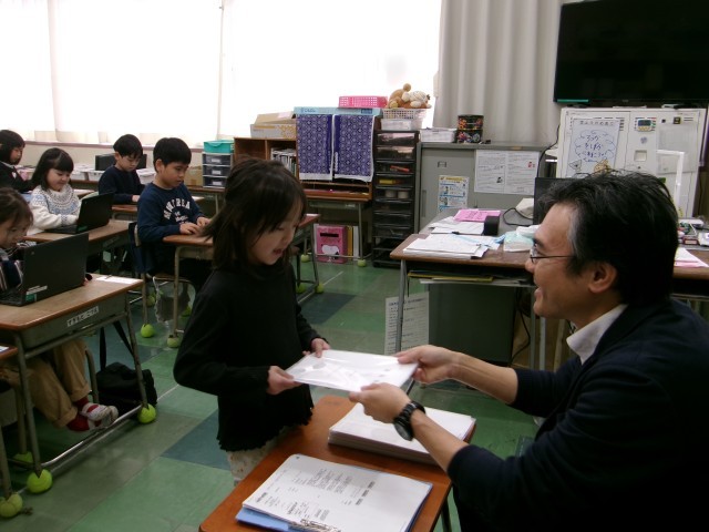 2学期最終日です。終業式の後、各学級で2学期のまとめや冬休み前の過ごし方のお話などのいろいろな学習に取り組んでいました。各教室では通知表が一人ひとりに渡されていました。頑張ったことを先生から伝えられ、ニッコリ笑顔で受け取っていました。友達の頑張りを拍手でたたえる姿もありました。