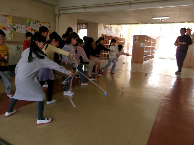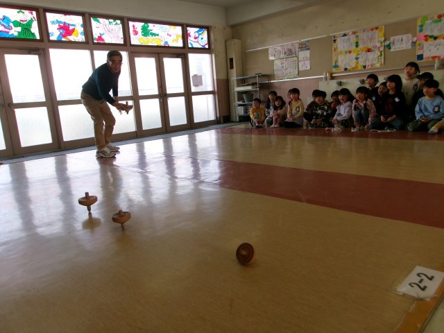 なかなかうまく回せず、しょんぼりする子もいましたが、こま回しの約束の、「うまくいかなくてもあきらめない」「泣かない」を思い出し、練習に励んでいました。そして何度か挑戦するうちに、こまが見事、くるくる回った瞬間、