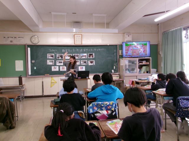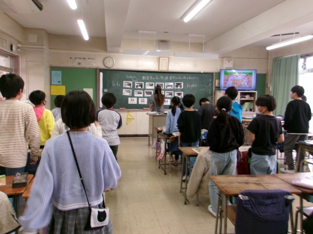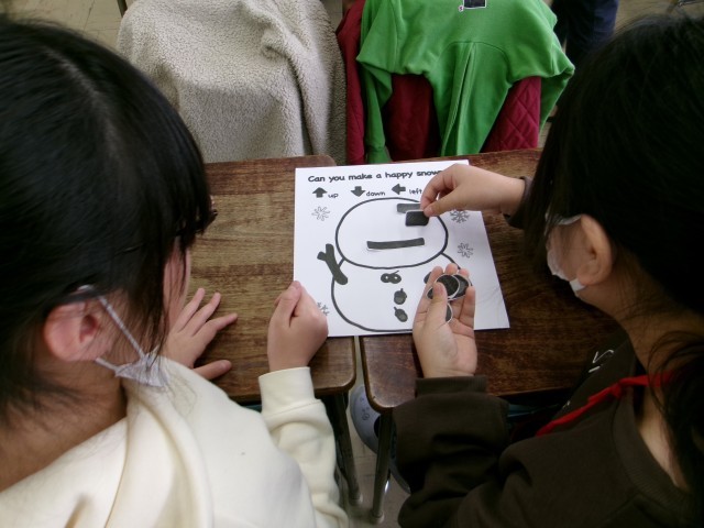 4年生の外国語活動の授業を参観しました。今日は英語を使って学校の教室の名前や道案内の仕方を覚えることをめあてに学習していました。先生が発音する教室の名前を、教科書を見ながら確認しました。また、道案内に使う「右」「左」「まっすぐ進む」など方向を表す英語を使って、体を動かしました。最後はペアで雪だるまの「福笑い」をして楽しみました。「up up!!」「right」「left」など、顔のパーツを置く場所を英語で伝え、雪だるまの顔を完成させました。いろいろな顔が出来上がり、盛り上がっていました。