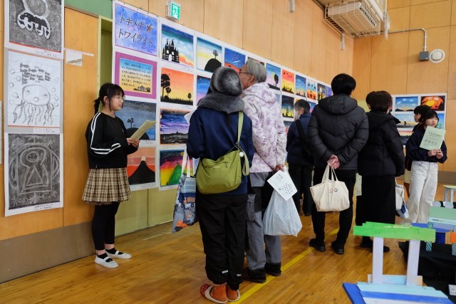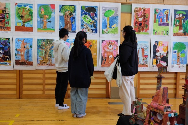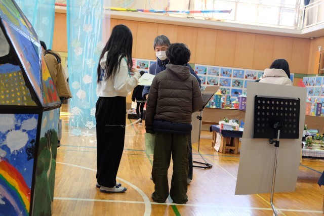 自分の保護者やお友達のお家の方を見つけて、積極的に話しかけている子もいました。6年生の作品は特に、作品作りの苦労や楽しかったっこと、作品に込めた思いなど、自分たちの言葉で伝えることができたようです。保護者の方も子どもたちが説明する様子を優しいまなざしで見守っていました。
