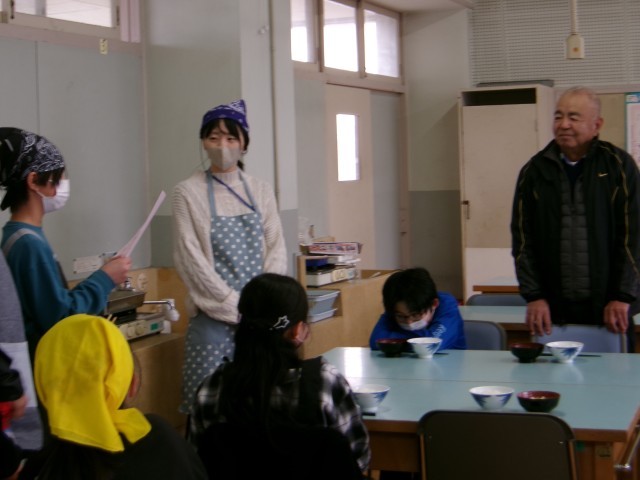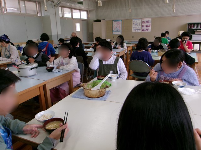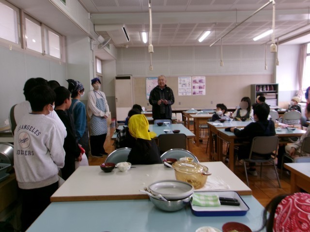 今日使用したお米は5年生が田んぼで育てたお米です。そこで、お米作りにかかわってくださった小俣さんをお招きし、ご飯を召し上がっていただくことになりました。代表児童より感謝の気持ちを伝えた後、「いただきます」をして試食しました。おこげができてしまった班もありましたが、自分たちで育てたお米を炊いたり、学習したことを活かして作った味噌汁もおいしくできたようです。小俣さん、ありがとうございました。