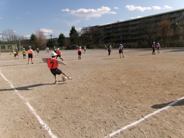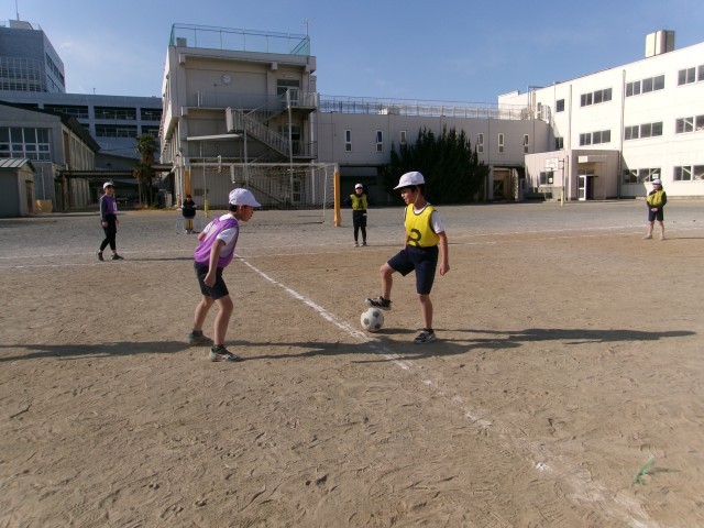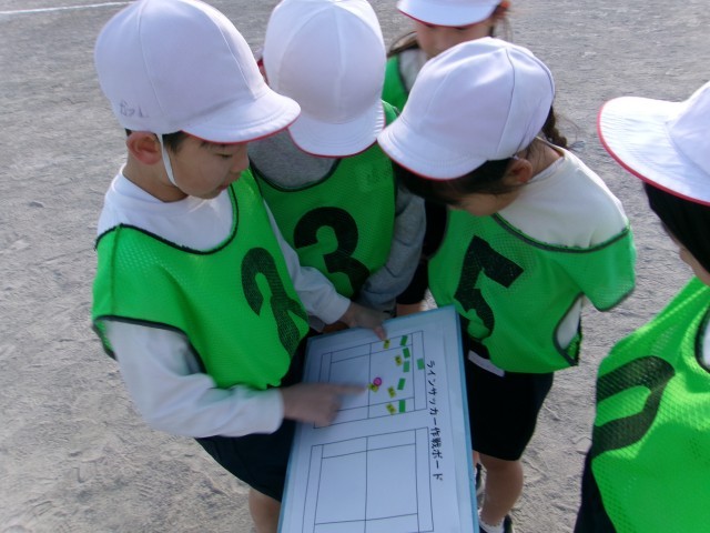 3年生のサッカーの授業を参観しました。「ラインサッカー」で、今日は「点を取るための作戦を考えよう」をめあてに学習しました。チームごとに作戦版を使って動き方を確認し、試合をし、ハーフタイムでも素早く集まり、作戦を確認したり、うまくいかなかったところを修正したりする姿がありました。てきぱき行動したり、仲間と声を掛け合いながらプレーしたりと主体的に学習に取り組む姿がありました。最後の振り返りでも、「サイドをうまく使うことで点数が取れた。」「ドリブルでゴール近くまで行き、敵に囲まれる前にパスをする」など、チームで考えた効果的な作戦を伝え合っていました。