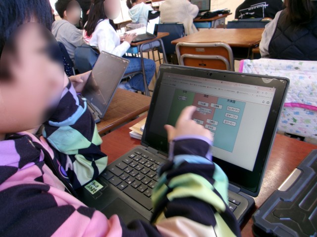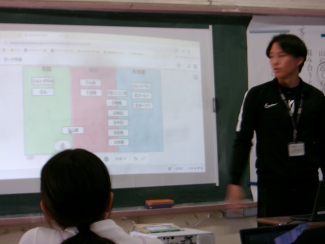5年生の国語の授業を参観しました。「和語・漢語・外来語」の学習で、その使い方や使い分けについて学習しました。同じ状況を表す文章でも、和語と漢語を使って表すと、文章のイメージや伝わり方が違うことを押さえた後、いろいろな熟語のカードの仲間分けに挑戦しました。タブレットを使って仲間分けをした後、自分の考えと友達の考えを比べて、その違いについて考えました。「生物」を「なまもの」と読むか「セイブツ」と読むかによって、仲間分けが違ってくることがわかりました。最後は、漢語中心で書かれた「保健委員会のお知らせ」の例文を、和語を中心に書き換え、1年生でもわかりやすい文章にする学習にチャレンジしました。友達の考えと自分の考えを見比べながら、今日の学習を振り返る姿がありました。