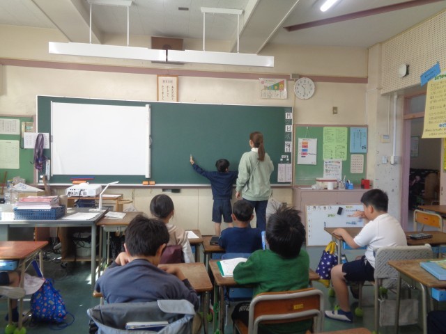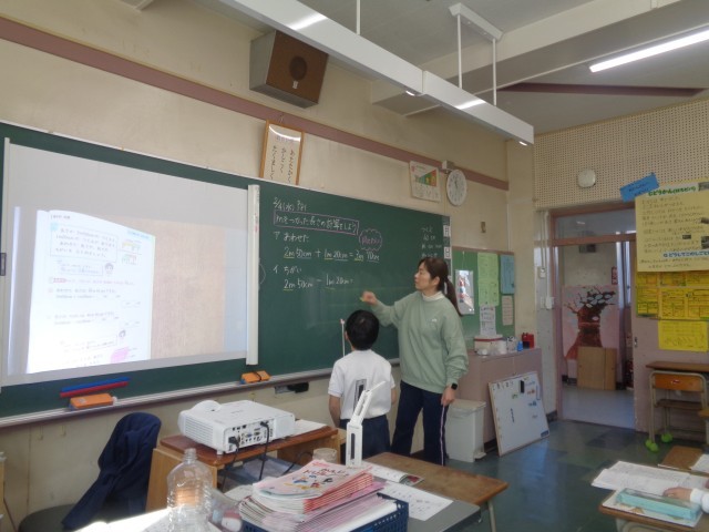 2年生の算数の授業を参観しました。「長さ」の単元の学習をしていました。導入では、「1m」の長さを手を広げた長さで表したり、机の縦の長さや教科書の厚さ、教室の長さの単位について考えるなど、長さと単位の関係や、長さの見当をつける学習から入りました。「教科書の厚さが、6(cm)だったら、国語辞典と同じになっちゃうよ」など、長さの感覚と実生活と関連付けながら楽しく考えていました。また、今日の学習の長さの計算では、単位同士で足したり引いたりする計算の仕方を言葉できちんと説明することができました。量感をしっかりと身に付けながら学習に取り組んでいます。