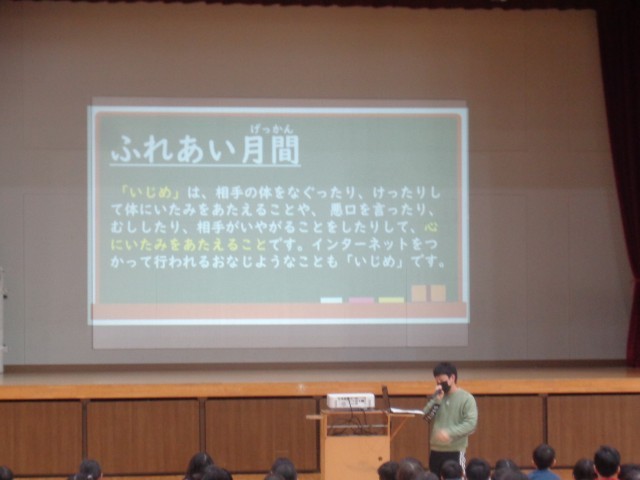 今日の児童朝会は、体育館に全校で集合して行いました。校長より「言葉について考えよう」をテーマにお話ししました。展覧会での6年生の子ども学芸員での礼儀正しい態度や言葉遣い、そして1年生が今、国語で取り組んでいるインタビュー学習での素敵な言葉遣いを例に挙げ、挨拶や日頃の言葉遣いについて見直していきましょうというお話をしました。また、生活指導部の先生からは、2月の生活目標「寒さに負けない体を作る」から、規則正しい生活をしていきましょうというお話と、2月のふれあい月間についてお話がありました。乱暴な言葉遣いや暴力は絶対にいけないこと、そうした言動がいじめにつながるというお話がありました。3学期もあと30日となりました。優しい言葉遣いや心遣い、そして、自分も相手も大切にする行動を心がけ、気持ちよく新年度を迎えてほしいと願っています。