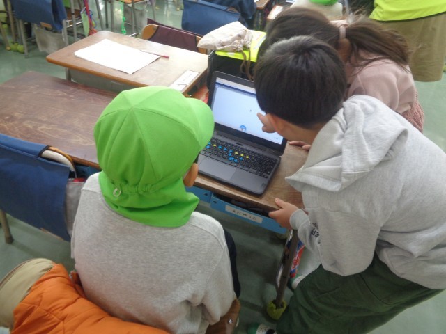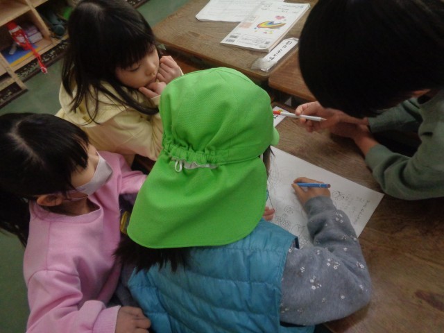 お勉強体験では、なぞり書きや線結びができるプリントを使ってお勉強します。1年生が先生役になり、鉛筆の持ち方やプリントの配り方などを張り切って教えていました。できたプリントに、花丸を付けてあげると、年長さんたちもニッコリ笑顔です。1年生が一生懸命年長さんたちに教える姿は、すっかり、お兄さん、お姉さんの顔になっていました。今から新1年生が入学してくるのを楽しみにしたいました。