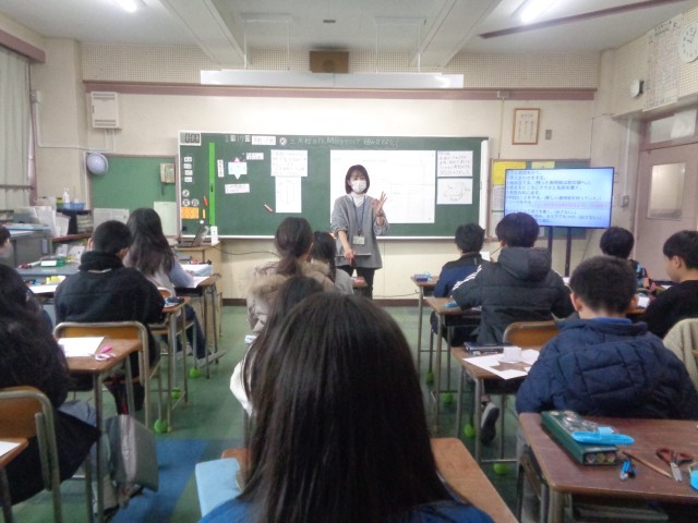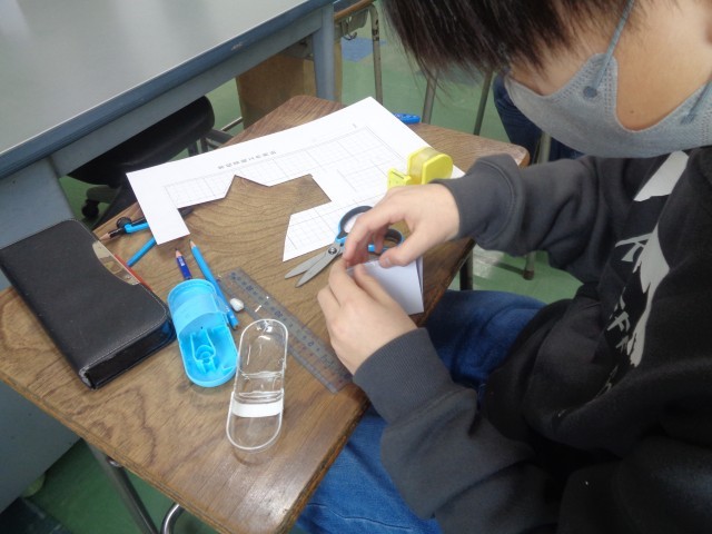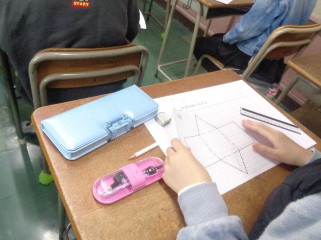 5年生の算数の授業を参観しました。「角柱と円柱」の単元の学習で、三角柱の展開図の学習をしていました。工作用紙で書き方の学習をした後、見本と照らし合わせて正しく作図できているかどうかを確かめ、組み立てました。できた三角柱をもとに、新たな課題に挑戦する子もいました。組み立てるイメージと切り開いて展開図を書くイメージを往還させることを通して、図形の豊かな見方をはぐくんでいます。