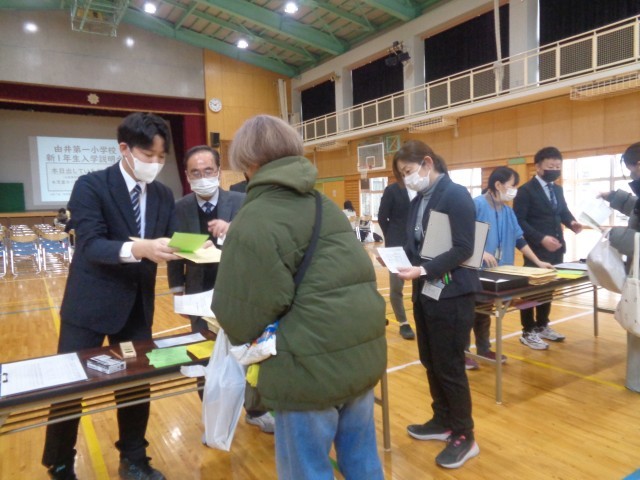 今日は体育館で令和8年度新1年生保護者会がありました。新1年生の保護者の皆様には本校の体育館にお集まりいただき、学校から保護者会資料を基に、入学式の日程や提出書類の記入の仕方、学校生活や持ち物について説明をさせていただきました。子どもたちが普段使っている防災頭巾や体育着、上履き入れや給食袋などについては具体物を使って説明しました。また、特別支援教室や日本語国際学級についての説明もありました。他にも、本校PTAの話や放課後子ども教室の紹介など学校にかかわる役員の方から入学に向けたお話がありました。さらに関係機関からは警察署の方にもお越しいただき、安全な登下校について、入学前に、通学路を一緒に歩き、危険個所を確認しておきましょうというお話がありました。盛りだくさんの説明会になりましたが、わからないことがあればいつでもご連絡ください。由井一小職員一同、お子様の入学を心からお待ちしています。