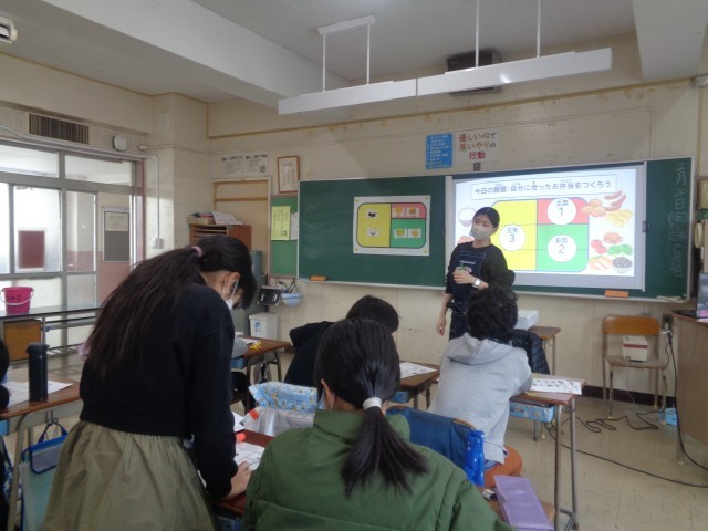 6年生の食育の授業を参観しました。「自分に合ったお弁当を作ろう」を主題に、自分の生活に合った食事を考えました。「体や脳を動かす」「筋力をアップさせる」「持久力・集中力をアップさせる」ための栄養の組み合わせについてスライドを見ながら確認した後、お弁当の主食、主菜、副菜のカードから自分の生活に合ったお弁当作りをしました。作った後の発表では、「彩を考えて組み合わせた」「好きな食べ物を先に考え、栄養素の組み合わせを考えた副菜を選ぶようにした」など、学んだことを活かたお弁当作りができました。後半は、「はちおうじっ子ミニマム【食育版】」の学習をしました。箸の持ち方や食器の並べ方、食品ロスや八王子ならではの給食の献立の問題など、バラエティに富んだ内容でしたが、しっかり学んでいました。