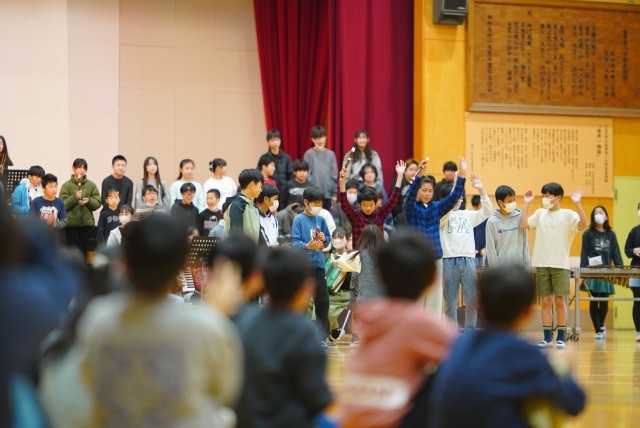 送る会の最後は全校合唱で締めくくりました。6年生のこれから進み道が明るく輝いたものになるようにという思いを込めて「虹」を全校児童で歌いました。1年生の元気な声と、6年生の大人びた美しい歌声、そして、2~5年生の優しい歌声がハーモニーとなて体育館中に響き渡り、感動的なフィナーレとなりました。