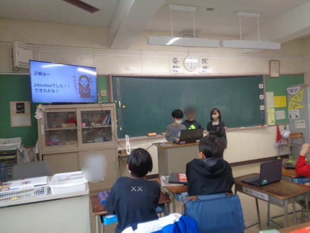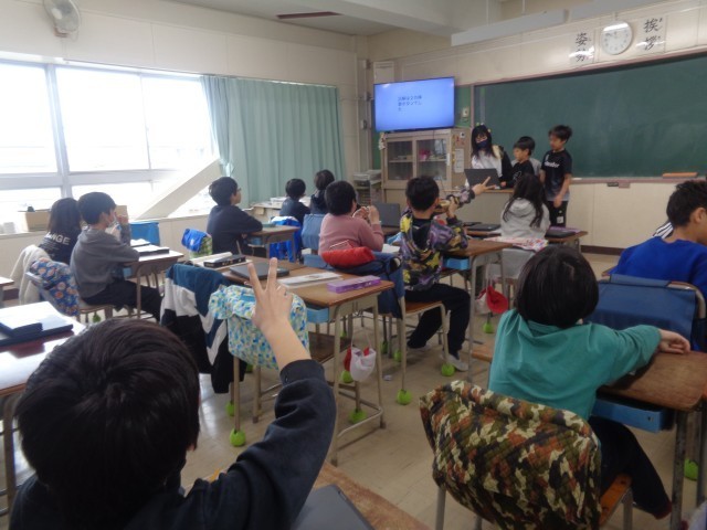 4年生の国語の授業を参観しました。「『便利』をさがそう」の単元では、身近な便利な道具や設備について調べ、それについてまとめ、伝わりやすく発表する学習をしています。「家庭で使う便利な道具」、「まちの中の便利な設備」などの課題について、相手に伝わりやすいように写真資料などを交えてスライドを作成し、グループごとに発表していました。クイズを入れるなど、みんなが興味をもって聞くことができるようどのグループも工夫していました。私自身も初めて知ったことも多く、子どもたちがいろいろな資料を参考にしながら調べていることが伝わる発表会でした。