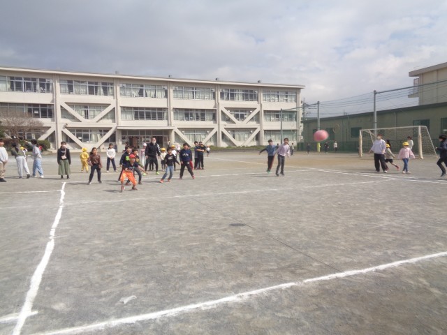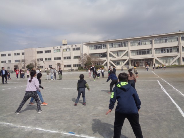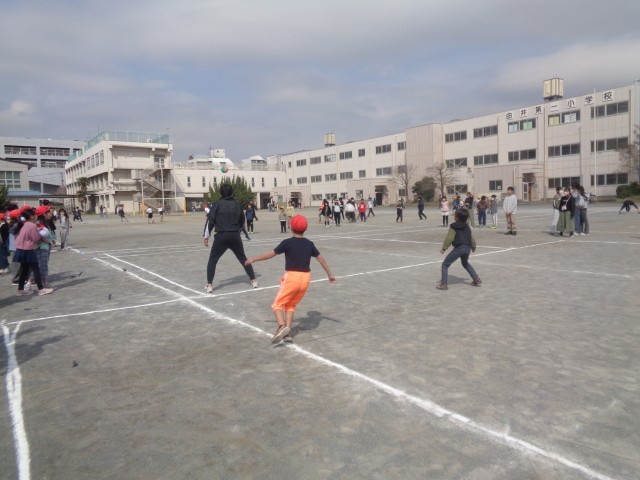今日はドッジボール大会の低学年の部で優勝したチームと先生チームが対決しました。先生チームは、「ボールは片手でキャッチ」「聞き手と反対の手で投げる」「コートを小さくする」というハンデを付けてゲームに臨みました。最初から圧倒的な強さで先生たちに次々とボールをぶつけた3年生チームでした。先生たちも、慣れない片手キャッチに戸惑ったり、鋭いボールを交わして逃げたりと善戦しましたが、結果は子供たちチームが勝ちました。試合後は、喜びあふれる笑顔で応援していた友達に駆け寄る姿があり、ほほえましかったです。