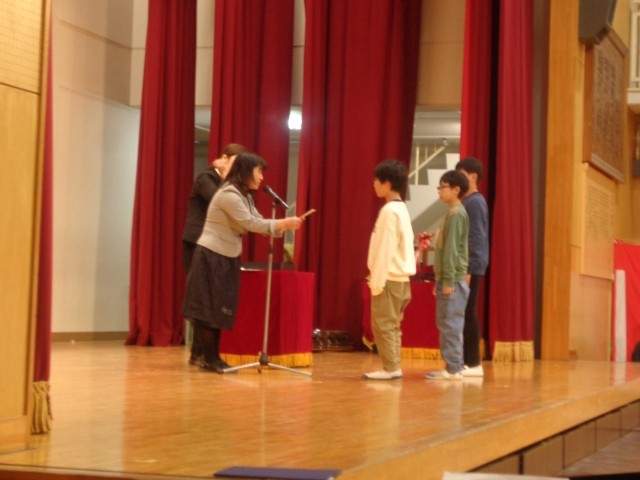 また、児童代表の言葉は3年生が発表しました。この1年間で取り組んだ漢字練習の成果や、運動会・展覧会で頑張ったことなどを発表してくれました。4年生になったら、低学年の子にやさしくできる4年生になりたいという抱負も述べ、高学年の仲間入りをする頼もしさを感じました。