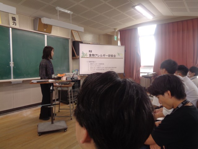新学期のスタートに備えて食物アレルギー研修会を行いました。最初にパワーポイントの資料を使って、アレルギーの症状に応じた対応やアレルギー対応が必要な児童についての共通理解を図った後、アレルギーを発症した児童を発見した際の連絡体制、エピペンの使用法などについてシミュレーション研修を行いました。また、後半は、栄養士の指導の下、アレルギー対応食の提供の仕方について学びました。アレルギー対応の給食の配膳の仕方や受け取り方など、質疑応答も含め、全員で細かいところまで共通確認ができました。明日から始まる給食に備え、子どもたちの健康で安全な学校生活のため、これからも研修を積み重ねていきます。