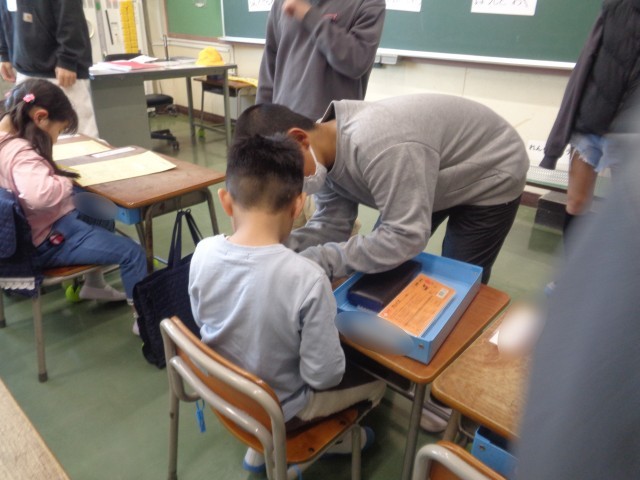 小学校生活1日目は、朝の支度から始まりました。6年生が1年生の教室に来てくれて、朝の支度のお世話をしてくれました。教科書をお道具箱に入れたり、ランドセルをロッカーにしまったりと、朝の準備のお手伝です。