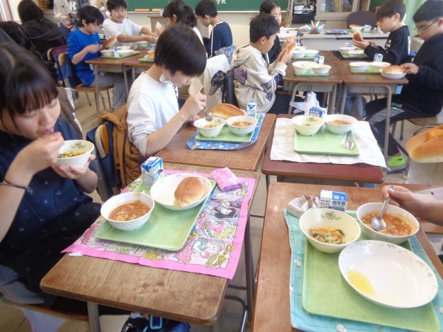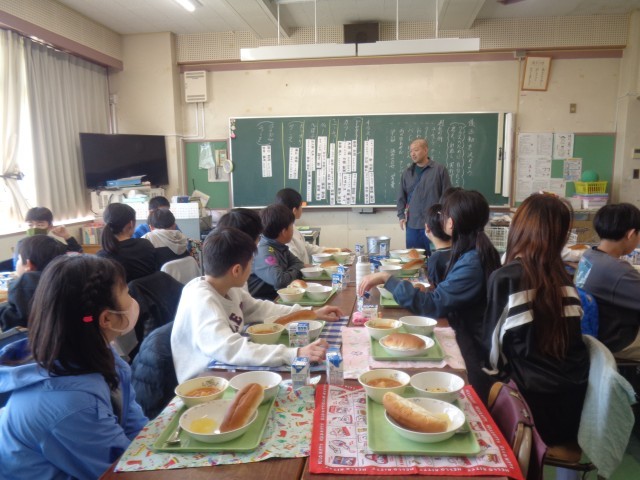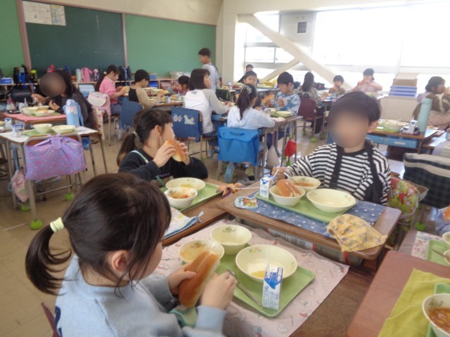 高学年の教室ではルールも定着しており、クラス替えがあってもスムーズに配膳が進んでいました。さすが高学年です。当番の子どもはもちろん、待っている子どもたちもおしゃべりひとつせず、姿勢よく座っていするがたがありました。作ってくださっている方に感謝の気持ちを込めて「いただきます」の声も聴かせてくれました。「勉強しっかり おなかがすいたら おいしい給食で充電(愛唱歌「由井一物語」より)」。やっぱり給食は子どもたちにとって元気の源です。