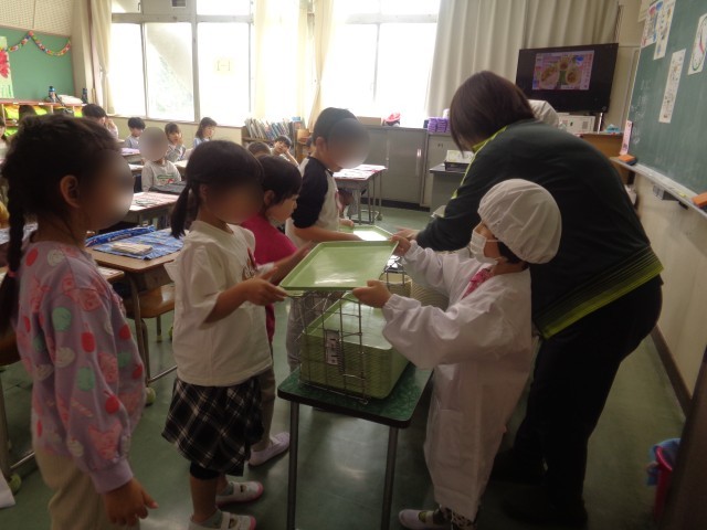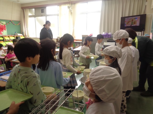 今日から1年生の給食が始まりました。先週、しっかりと練習していたので、本番でも落ち着いて準備を進めていました。今日はいろいろな先生が応援に駆け付け、1年生の給食の配膳を手伝いました。1年生は、教えてもらったやり方をしっかりと思いだしながら、上手に配膳できていました。給食当番さんも体験し、上手に盛り付けもできました。花丸1年生です。