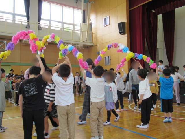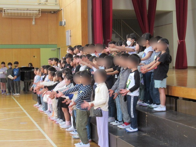 2年生と5年生からは1年生にプレゼントです。2年生からは朝顔の種をもらいました。これから生活科で育てていきます。また、5年生からは校歌の歌詞が書いてある掲示物をもらいました。全校での校歌斉唱では、その歌詞の掲示物を見ながら歌っている子もいました。早く学校の校歌を覚えて、一緒に歌いましょうね。1年生からは、お礼の気持ちを込めて「1年生マーチ」の歌を披露しました。かわいらしく元気な歌声に、大きな拍手が沸き上がりました。今日から1年生も休み時間に校庭に出て遊ぶことができます。みんな一緒に仲良く遊びましょうね。そして、1年生が困っていたら、手を貸してあげてくださいね。