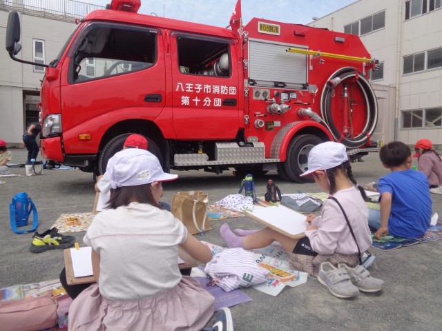 今日は2年生の消防車の写生会がありました。消防署や消防団の方に協力していただき、消防自動車2台を校庭に入れて子どもたちが来るのを待っていてくれました。さっそく、2年生が消防車の周りに集まって、絵を描く場所を探しました。真正面から描こうとする子、後ろのホースの部分に興味をもつ子など、それぞれ好きな場所を選んで描き始めました。先生から描くポイントとして、「最初にタイヤを大きく描くといいよ」「一番描きたいところ、かっこいいと思うところをじっくり見て描いてごらん」と教えてもらうと、タイヤから描き始める子、興味を持った梯子部分を詳しく描く子など、個性豊かに消防自動車を描き始めました。