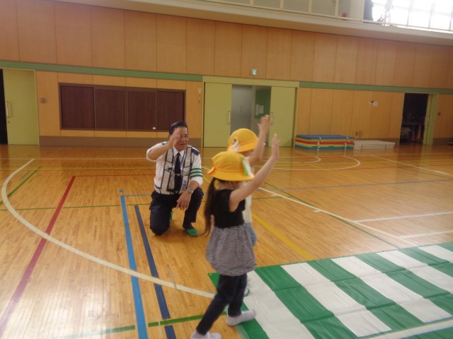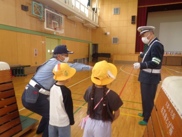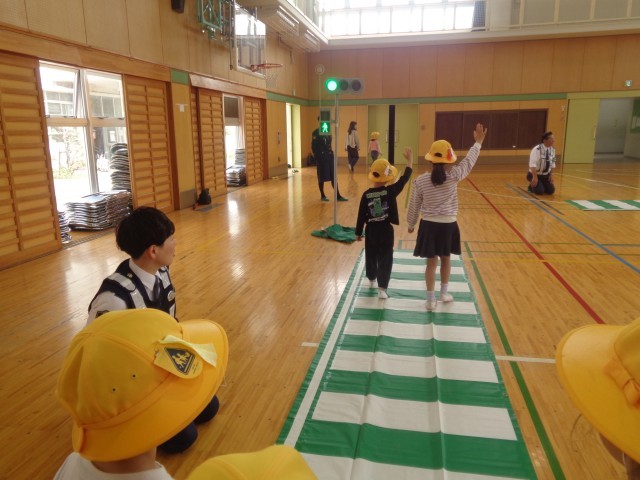 体育館に作った横断歩道を「右・左・もう一度右」としっかり確認して渡る練習をします。おまわりさんや交通安全協会の方に見守っていただきながら、安全に気を付けて横断歩道を渡ることができました。信号機のない横断歩道の渡り方もしっかりと学習しました。また、「止まれ」の標識のあるところでは、必ず止まって安全を確認することも教えてもらいました。最後に、歩行者用信号機を必ず見て安全に気を付けて横断歩道を渡ること、交通標識の「止まれ」では必ず止まって安全を確認すること、道路では全体に遊ばないことを確認して終わりました。南大沢警察署の皆さん、交通安全協会の皆さん、ありがとうございました。今日学習したことをしっかりと守り、これからも安全に登下校しましょうね!
