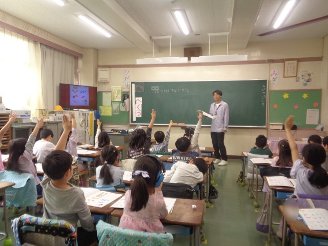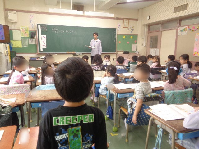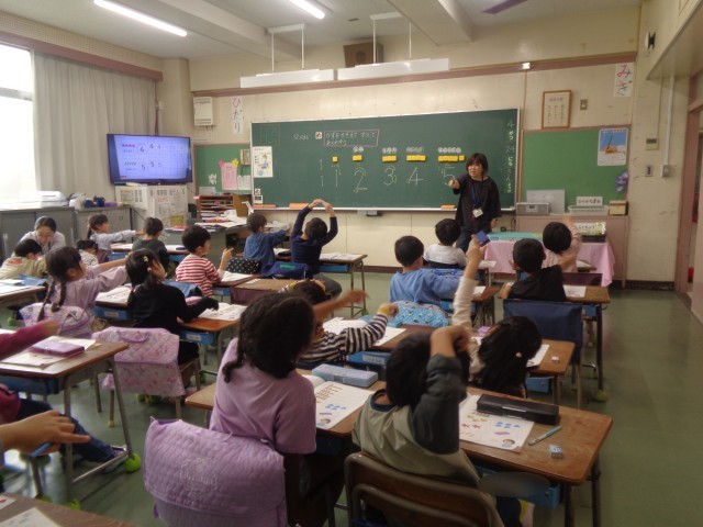 1年生の算数の授業を参観しました。10までの数字の数え方や数字の書き方の学習に取り組んでいます。今日は5までの数をイラストを見ながら数えたり、数の分だけ丸を塗ったり、数字を書く練習をしたりしていました。先生の問いかけに元気いっぱい手を挙げて答える姿がありました。「姿勢がいいですね」「『はい』とお返事して答えることができていますね」「しっかりと椅子を入れて立っていて、素敵ですね」答えだけでなく学習に向かう姿勢をたくさん褒められていました。張り切って勉強しています。